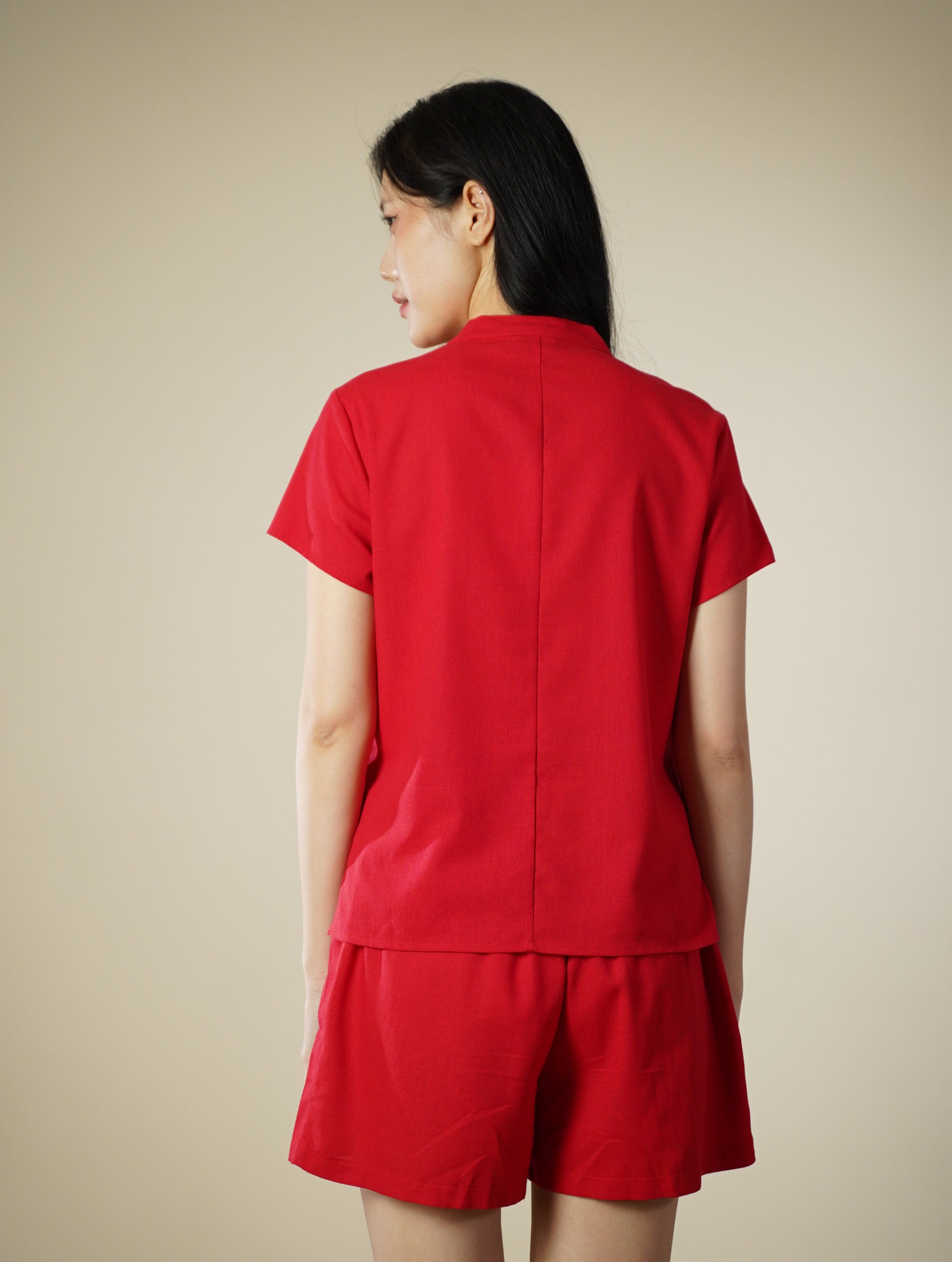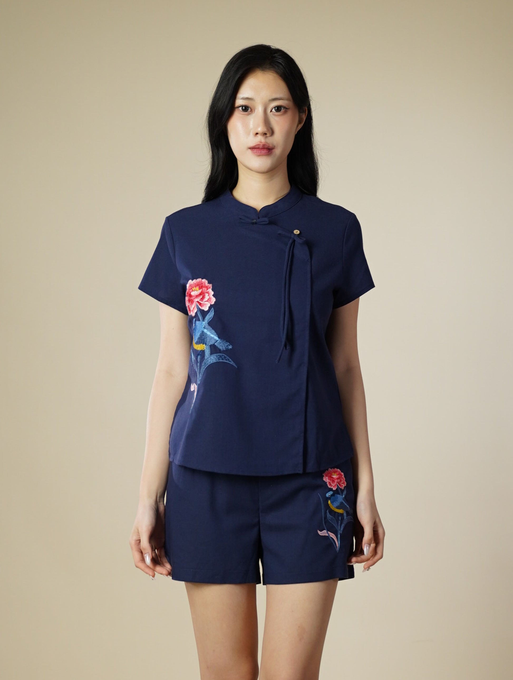 Embroidered Mandarin Collar Ribbon Short Sleeve Top