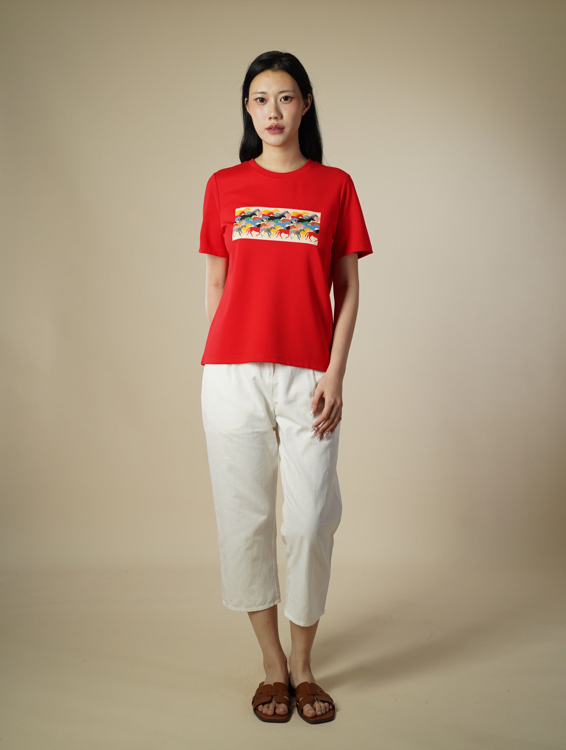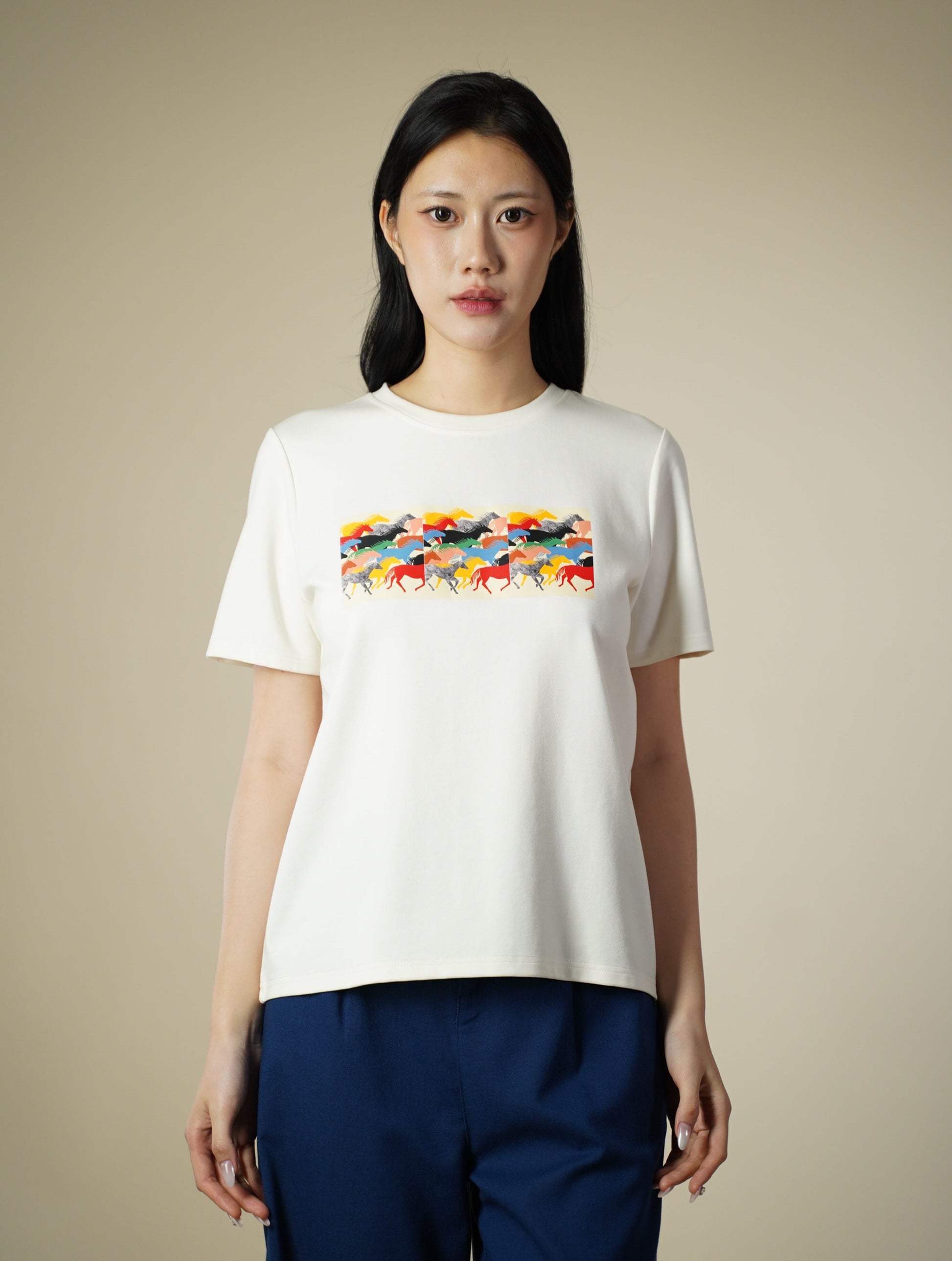 - Rectangular multi-color running horse print across the chest, vibrant colors